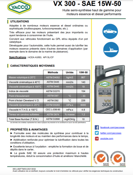 Choix N°1: La Motul 4100 Syn-nergie 15W50 est une APi SP Choix N°2: La Yacco 300 VX 15W50 est une APi SL