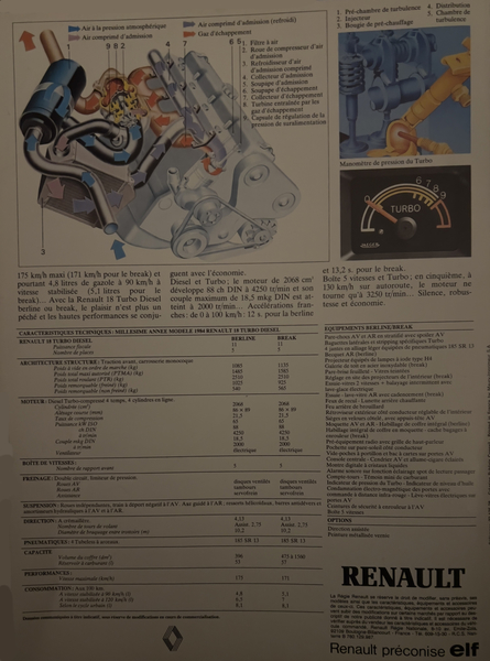 Cette voiture contre-attaque aussi avec un tout dernier modèle à moteur diesel turbo. Il fallait s'y attendre. Renault tenait tout prêt ce 2 litres (6 CV), déjà monté sur les 20 et les 30, sur la